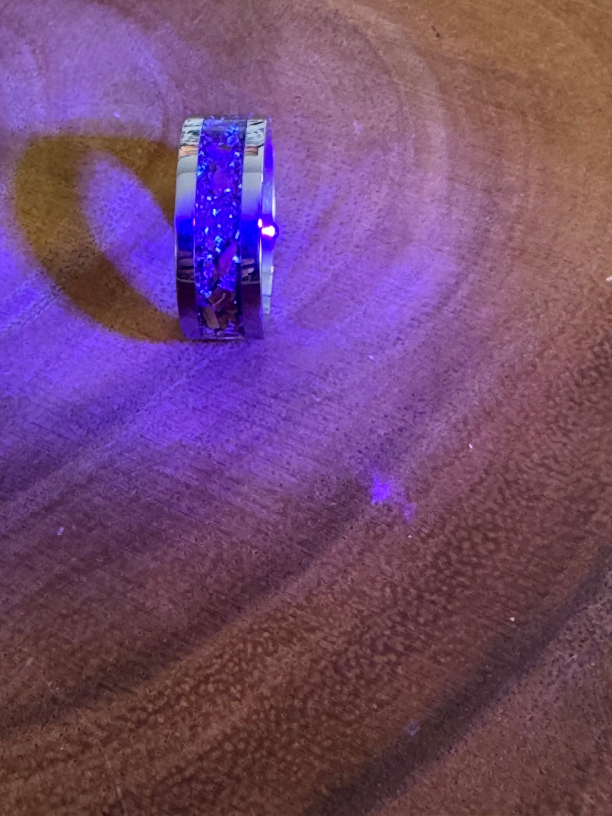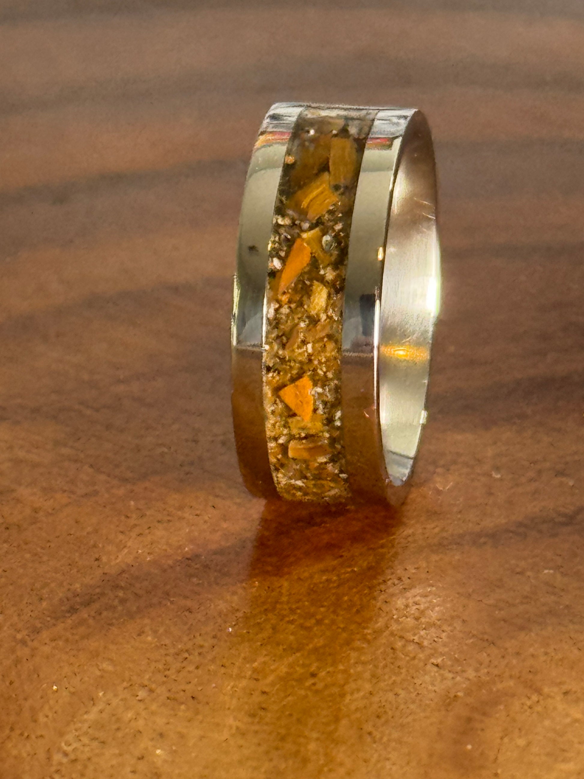 This size 8 ring features an 8mm wide stainless-steel band designed to mimic the natural texture of a creek bed. It is set with a Tigers Eye stone that adds warm, earthy tones, enhanced by a subtle UV glow effect for a unique visual appeal. Crafted for durability and distinctive style, this ring offers a sophisticated blend of rugged nature-inspired design and modern craftsmanship.